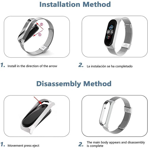Specifications: Product material: stainless steel Product weight: about 41g Applicable products: For xiaomi mi band 6/5/4/3 Suitable for wrist size range: 165mm—210mm Tips: This product has only frame + strap, does not contain the watch body. The strap does not fit for Amazfit band 5,please double check before order Package Included: 1*For Mi Band 6/5/4/3 Strap 1* Adjustment Tool